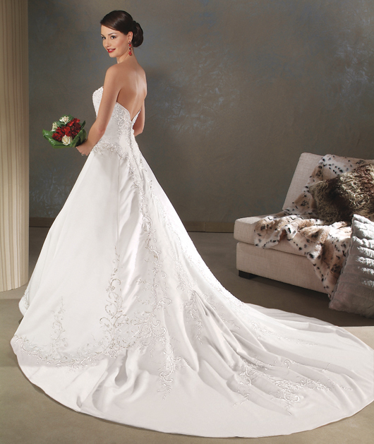 Modest A-Line bridal gown with soft sweetheart neckline, delicate embroidery appliqué decorate the fit bodice, the bottom of the quality satin skirt, the V back bodice, the back skirt and the semi-cathedral train, the back bodice with inner zipper closure.