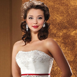 Handmade Japanese duchess satin wedding dress, charming strapless sheath silhouette, delicate embroidery and shimmer Swarovski crystal beads embellish the neckline and the bottom of the skirt, this modest traditional gown features contrasting red band design around the natural waist, matching red panel inserted into the chapel length train, making this gown very distinguishable.